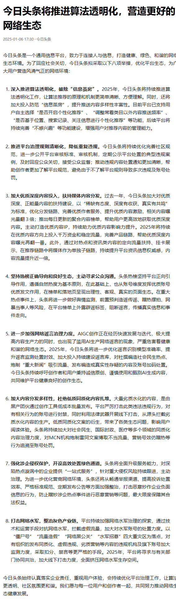 今日头条拟采取八项举措优化平台生态:推进算法透明化,营造更好的网络生态今日头条拟采取八项举措优化平台生态:推进算法透明化,营造更好的网络生态