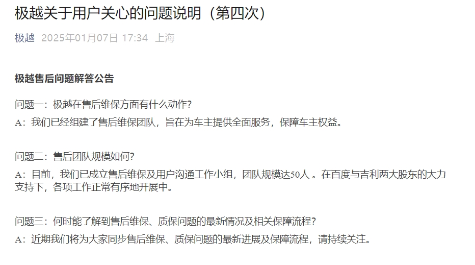 极越汽车:已成立50人售后维保工作小组,获百度与吉利支持极越汽车:已成立50人售后维保工作小组,获百度与吉利支持